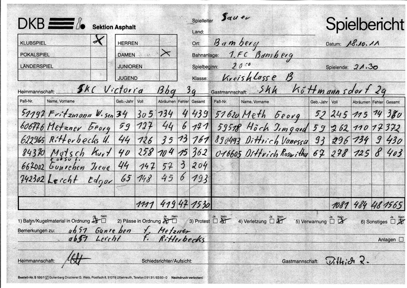 Ein Sieg mit 35 Holz . Zu erwähnen ist die aufsteigende Form von Vanessa Dittrich mit 430 . Ein Spiel das zu Anfang schon als verloren schien , konnte dank der guten Ergenisse der beiden letzten Spielerinnen doch noch zu eine Sieg erspielt werden